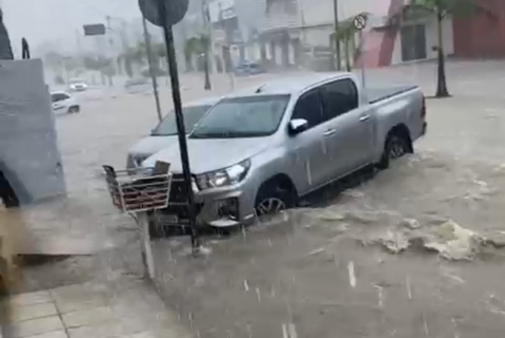 A forte chuva que ocorreu no início da tarde desta sexta-feira (27), causou alagamentos em ruas e avenidas, ocasionado transtornos aos comerciantes e moradores da cidade.