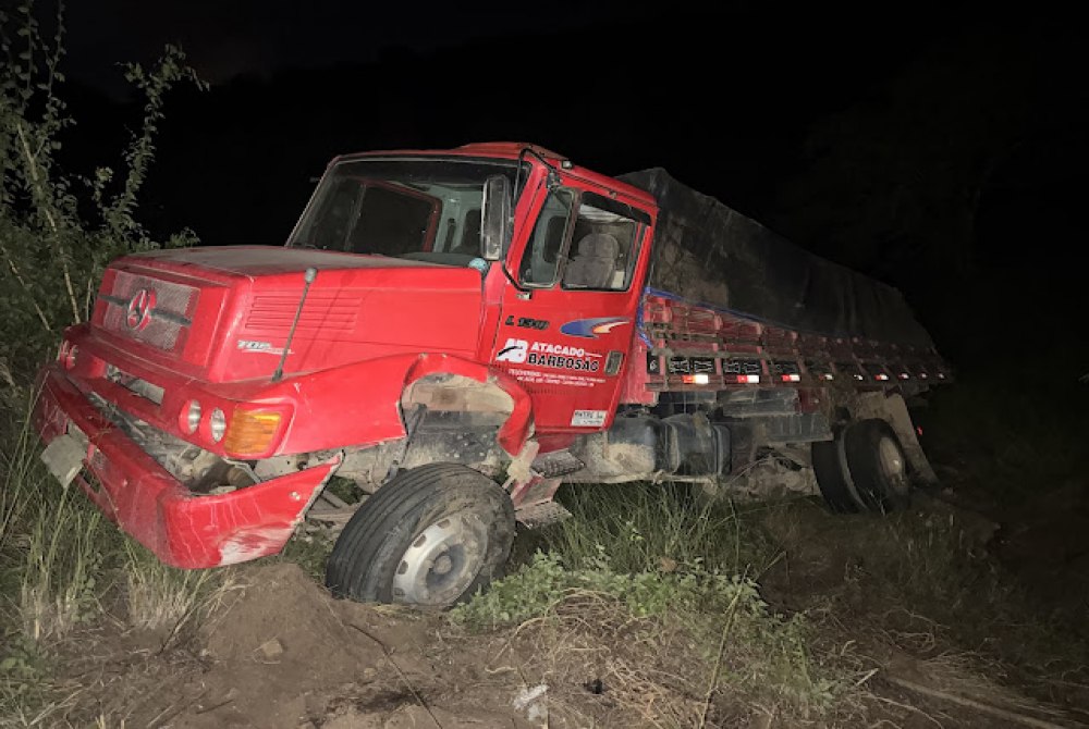 Um caminhão M.BENZ/L 1318, de cor vermelha, placa de Capim Grosso, saiu da pista e desceu a ribanceira nas proximidades da curva do Salomão, no município de Mairi.