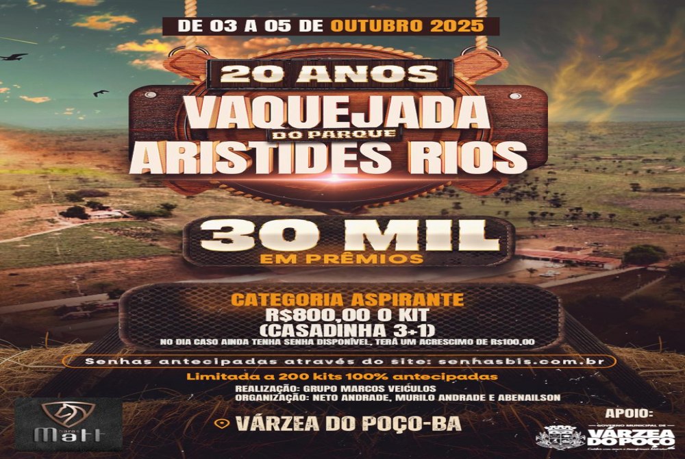 O Parque de Vaquejada Aristides Rios, irá realizara entre os dias 03 a 05 de Outubro, a grande e tão esperada Vaquejada de Várzea do Poço, com 30 mil reais em prêmios, além de atrações musicais e muitas outra novidades.
